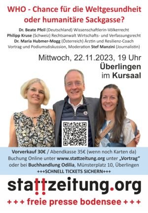 Für Kurzentschlossene: Die Corona-Widerständler Dr. Maria Hubmer-Mogg, Philipp Kruse und Dr. Beate Pfeil kommen an den Bodensee!