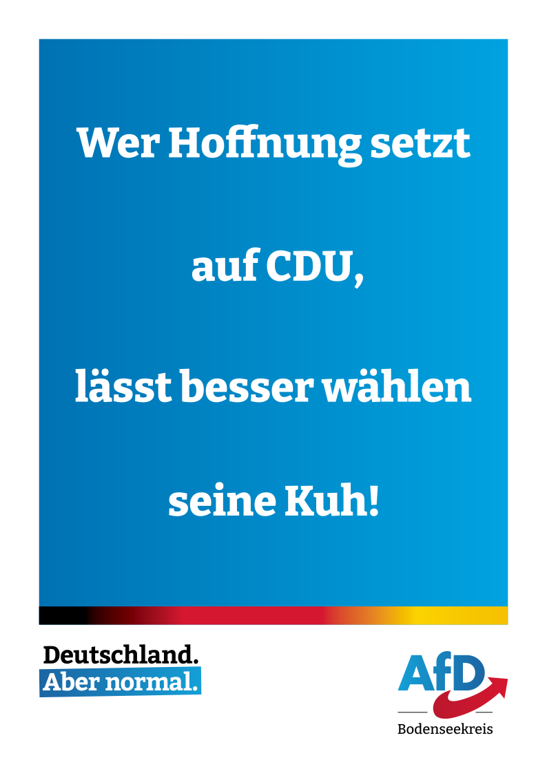 Am morgigen Montag, den 8. Januar findet um 11.30 Uhr in Salem-Neufrach die Demo der Landwirte im Bodenseekreis statt, die nicht nach Ravensburg fahren. Der Badische Landwirtschaftliche Hauptverband (BLHV) ruft dazu auf und lässt neben seinem Vizepräsidenten Karl-Heinz Mayer auch den Bundestagsabgeordneten Volker Mayer-Lay (CDU) reden. Die größte Oppositionspartei wurde leider nicht eingeladen, obwohl das Anliegen der Landwirte auch bei der AfD Unterstützung findet.
