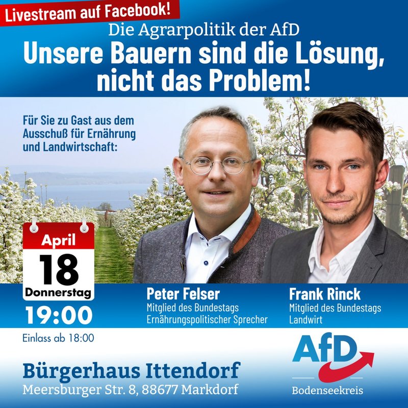 Wir heißen alle Interessierten willkommen am Donnerstag, den 18.04.2024 um 19 Uhr (Einlass ab 18 Uhr) im Bürgerhaus Ittendorf, Meersburger Straße 8, 88677 Markdorf. Es wird auch einen Livestream auf Facebook geben.