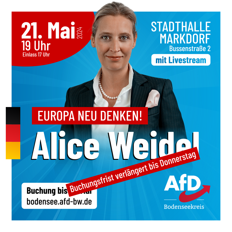 Jetzt heißt es schnell sein! Wer unsere Bundestagsabgeordnete und AfD-Bundessprecherin Alice Weidel einmal in echt erleben will, hat dazu Gelegenheit am 21. Mai in Markdorf bei unserer Wahlkampfveranstaltung Europa neu denken. Aus Sicherheitsgründen ist allerdings eine vorherige Anmeldung über unsere Buchungsseite erforderlich. Tickets sind nicht übertragbar. Die Buchungsfrist endet bereits am 14. Mai!
