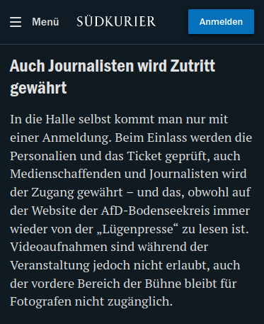Bei unserer Wahlkampfveranstaltung am Dienstag in Markdorf mit Alice Weidel war auch die Presse dabei, vom Spiegel über die Schwäbische bis zu Björn Winter haben sich alle ordnungsgemäß angemeldet und sich auch als Presse zu erkennen gegeben. Einzig Denise Kley vom Südkurier hat sich nicht als Journalistin ausgewiesen und bei der Anmeldung sogar eine falsche Adresse angegeben. Der Grund für dieses Verhalten war wohl die Angst, dass wir ihr den Zugang verwehren könnten. Zumindest schreibt sie das in ihrem Bericht, weil doch
