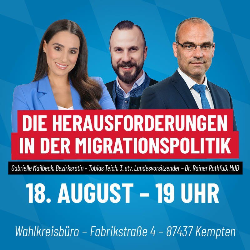 Am Sonntag, den 18. August 2024 findet um 19:00 Uhr im nahe gelegenen Kempten, Fabrikstraße 4 eine Info-Veranstaltung zur Migrationspolitik statt.