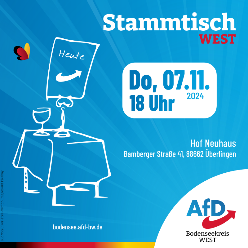AfD-Stammtisch WEST am Donnerstag, 7. November 2024 um 18 Uhr im Hof Neuhaus