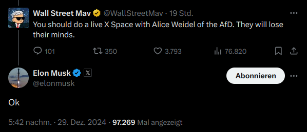 Elon Musk will sich mit Dr. Alice Weidel auf seiner Plattform X öffentlich unterhalten:
