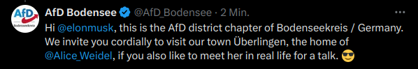 (Deutsch: Hallo Elon Musk, hier schreibt der AfD Kreisverband Bodenseekreis. Wir laden Sie herzlich zu einem Besuch unserer Stadt Überlingen ein, dem Heimatort von Dr. Alice Weidel, falls Sie sie auch in der realen Welt auf ein Gespräch treffen wollen.)
