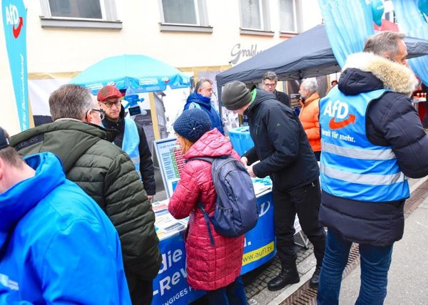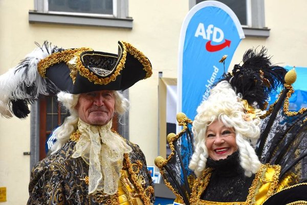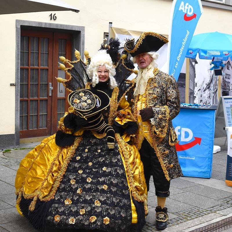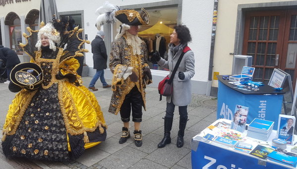 Die Fasnet läuft sich gerade warm, doch wir sind schon mitten drin: Zwei Wahlkämpfer im venezianischen Kostüm empfingen heute die neugierigen Wochenmarktbesucher vor unserem Infostand. Das von AfD-Flugblättern und Süßigkeiten pralle Füllhorn leerte sich ziemlich schnell… Vielen Dank, Sylvia und Henrik, für den zauberhaften Auftritt!