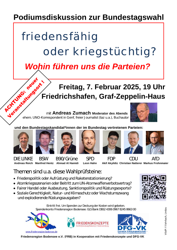 Heute Abend, Freitag, den 7. Februar 2025, um 19 Uhr findet im Graf-Zeppelin-Haus in Friedrichshafen die Podiumsdiskussion der Friedensregion Bodensee statt.
