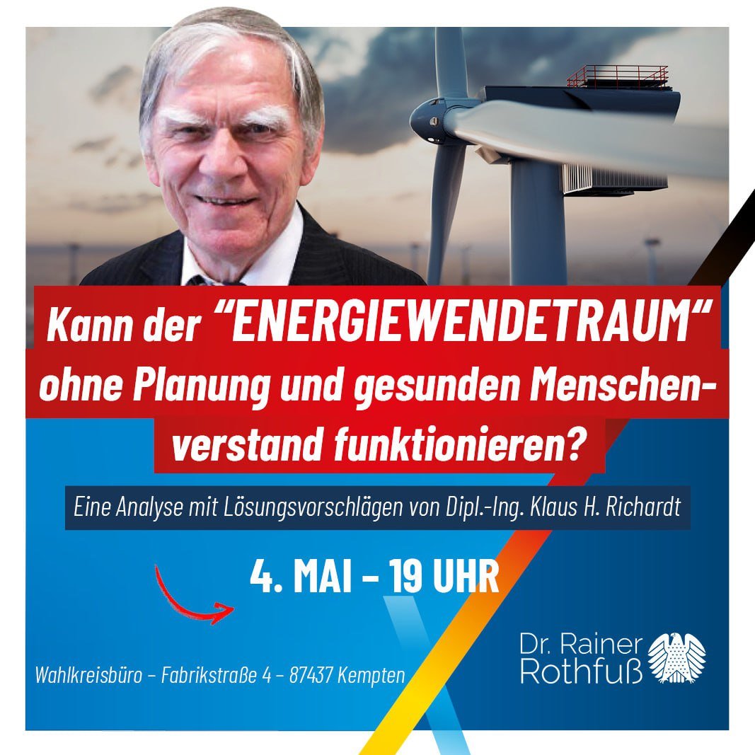 Der AfD-Kreisverband Oberallgäu-Kempten lädt herzlich ein zum "Energiewendetraum"-Vortrag von Dipl.-Ing. Klaus Richardt mit Diskussion am Sonntag, den 4. Mai um 19 Uhr im Wahlkreisbüro Oberallgäu von Dr. Rainer Rothfuß (MdB), St. Mang Versammlungssaal Gebäuderückseite, Fabrikstr. 4, 87437 Kempten.