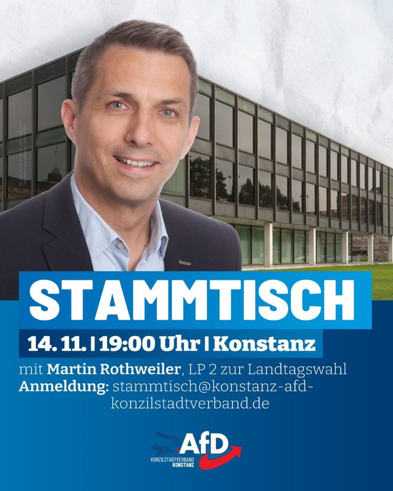 Die AfD in Konstanz lädt ein zu einem Stammtisch am Freitag, den 14. November 2025 um 19 Uhr mit Martin Rothweiler, dem AfD-Direktkandidaten in Villingen-Schwenningen. Er spricht zum Thema: