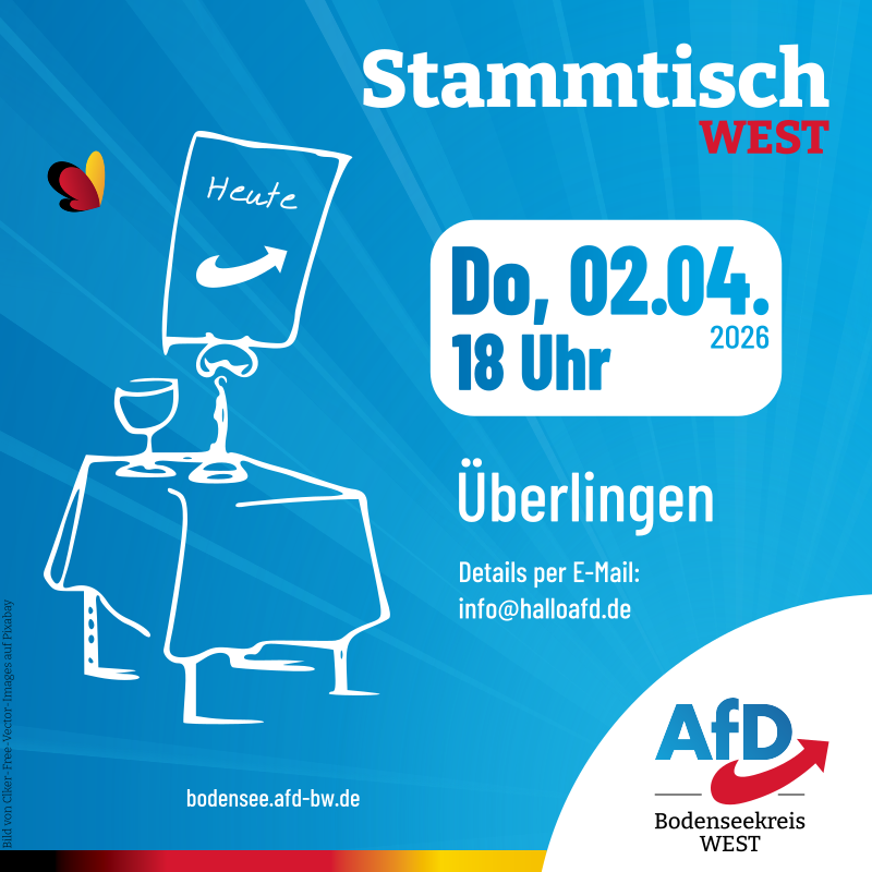 Am Donnerstag, den 2. April 2026 um 18 Uhr ist wieder der AfD-Stammtisch in Überlingen.