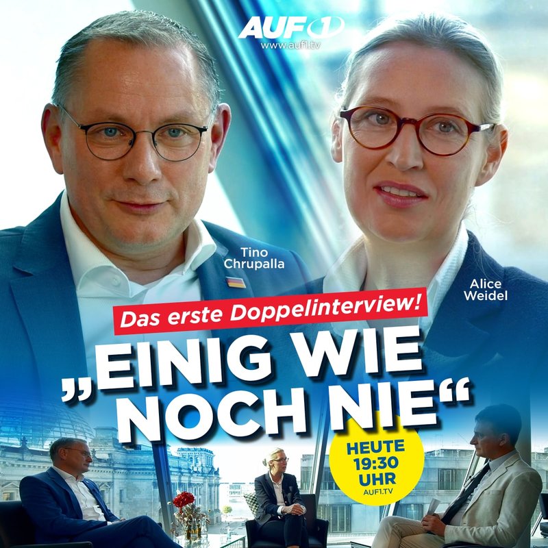 Der beliebte alternative Internet-Sender AUF1 strahlt heute Abend (27.06.) ab 19.30 Uhr bei www.auf1.tv ein Interview der AfD-Doppelspitze aus: Alice Weidel und Tino Chrupalla! Hoch aktuelle politische Fragen werden noch vor dem AfD-Parteitag beantwortet: Gibt es einen Streit um die Spitze? Wie ...