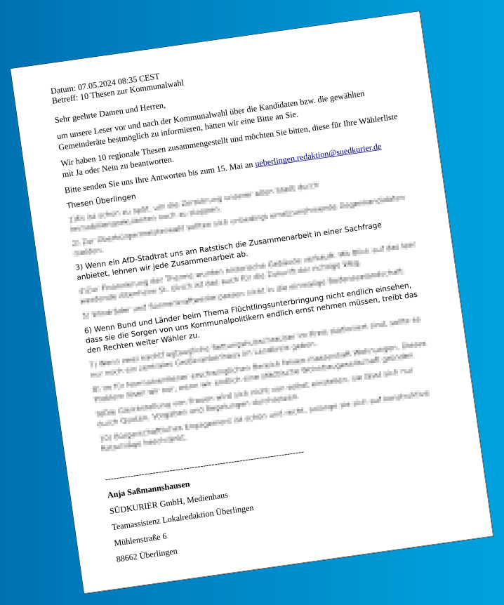 Uns hat eine Anfrage des Südkuriers erreicht. Anja Sassmannshausen schreibt uns: „um unsere Leser vor und nach der Kommunalwahl über die Kandidaten bzw. die gewählten Gemeinderäte bestmöglich zu informieren, hätten wir eine Bitte an Sie. Wir haben 10 regionale Thesen zusammengestellt und m...