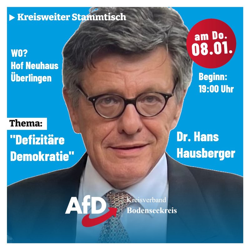 Kreisweiter Stammtisch mit Dr. Hans Hausberger zum Thema "Defizitäre Demokratie" am Donnerstag, den 8. Januar 2026 um 19 Uhr im Hof Neuhaus in Überlingen Ab 18 Uhr ist die Küche geöffnet. Wir freuen uns auf bekannte und neue Gesichter in gemütlicher Runde!