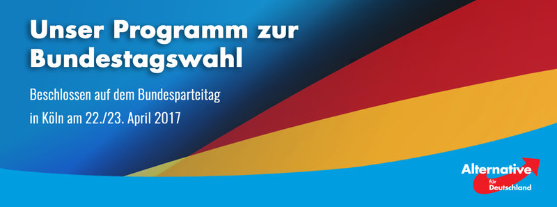 Es ist volbracht! Das Bundestagswahlprogramm, welches die AfD auf ihrem Bundesparteitag vom 22. bis 23. April in Köln erarbeitet hat, ist nun verfügbar. Hier gehts zur Online Fassung: