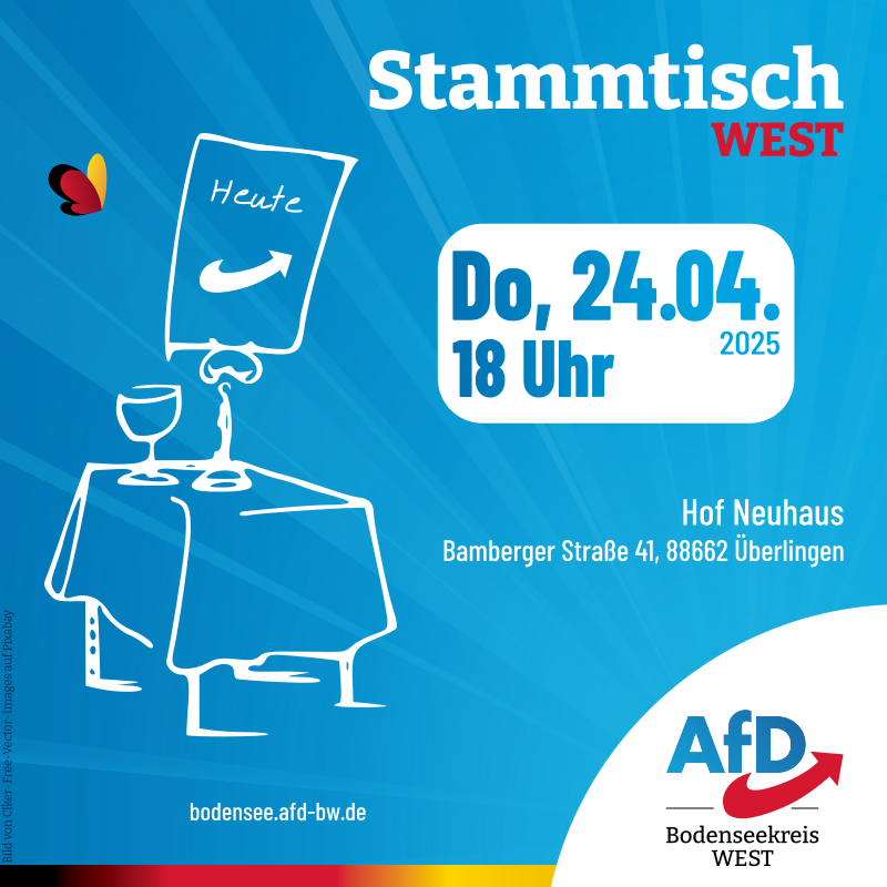 Am Donnerstag, den 24. April 2025 um 18 Uhr ist wieder der AfD-Stammtisch West im Hof Neuhaus. Im ersten Teil berichtet Hans-Diether aus dem Kreistag und dem Gemeinderat. Im zweiten Teil werden wir uns anschauen, warum Einwanderung aus humanitären Gründen nicht funktioniert. Wir freuen uns a...