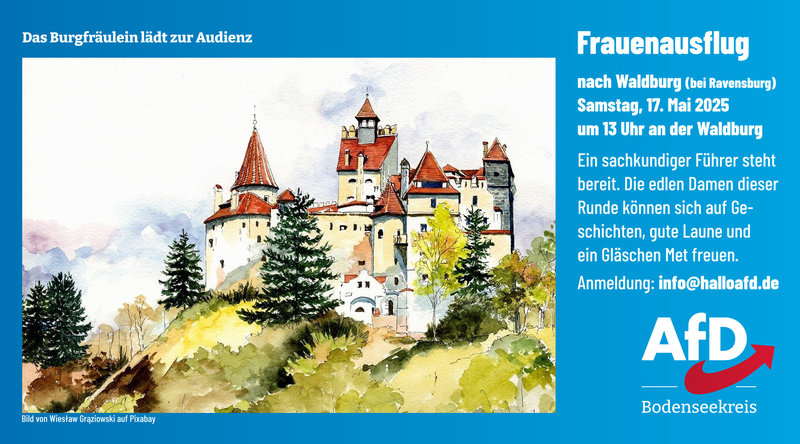 Das Burgfräulein lädt zur Audienz: Frauenausflug nach Waldburg (bei Ravensburg) am Samstag, den 17. Mai 2025 um 13 Uhr an der Waldburg in 88289 Waldburg Fahrgemeinschaften werden nach Bedarf organisiert. Es steht wieder ein sachkundiger Führer bereit. Die edlen Damen dieser Runde können sich...