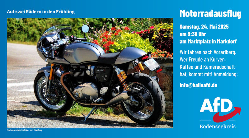 Auf zwei Rädern in den Frühling: Motorradausflug am Samstag, den 24. Mai 2025 um 9:30 Uhr, Treffpunkt am Marktplatz in Markdorf Wir fahren nach Vorarlberg. Es sind alle willkommen, die Freude an Kurven, Kaffee und Kameradschaft haben! Anmeldung an: info@halloafd.de