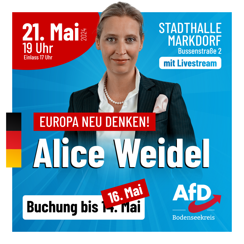 16.05.2024: Letzter Tag zur Anmeldung: Alice Weidel in Markdorf