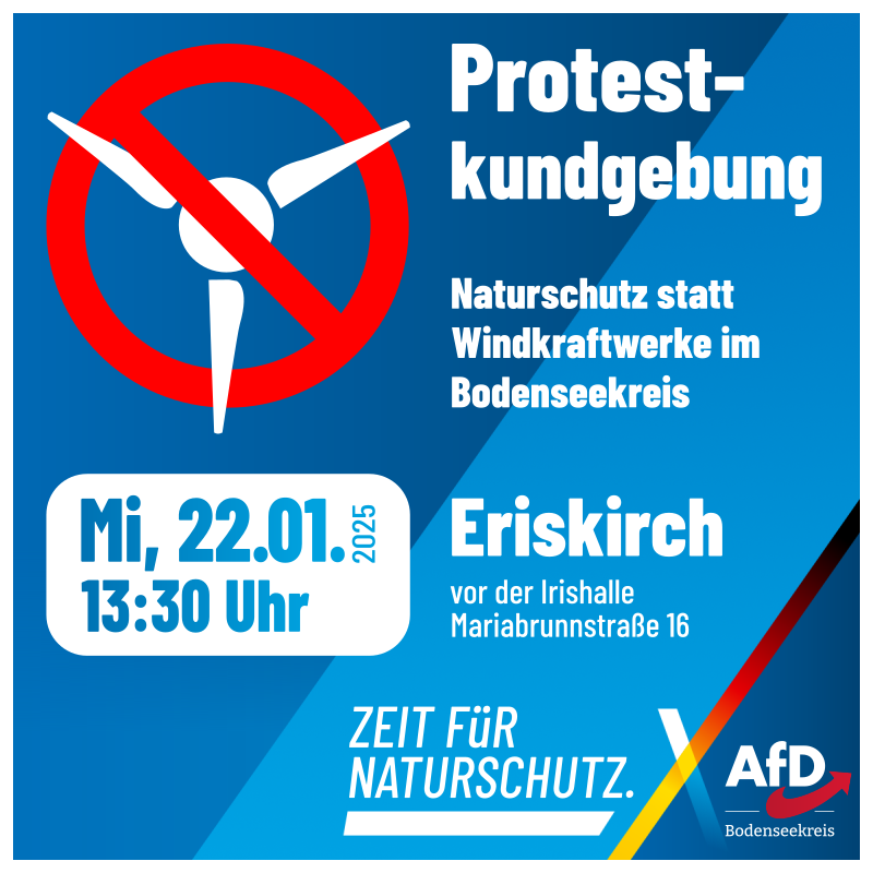 Wir halten am Mittwoch, den 22. Januar 2025 ab 13:30 Uhr in Eriskirch vor der Irishalle, Mariabrunnstraße 16 eine Protestkundgebung ab. Engagierte Leute aus dem AfD-Kreisverband beleuchten in ihren Reden den Irrsinn der Klimapolitik und die fatalen Konsequenzen der Energie-Wende für die Natur und Landschaft, für die Industrie und die Verbraucher in Deutschland.