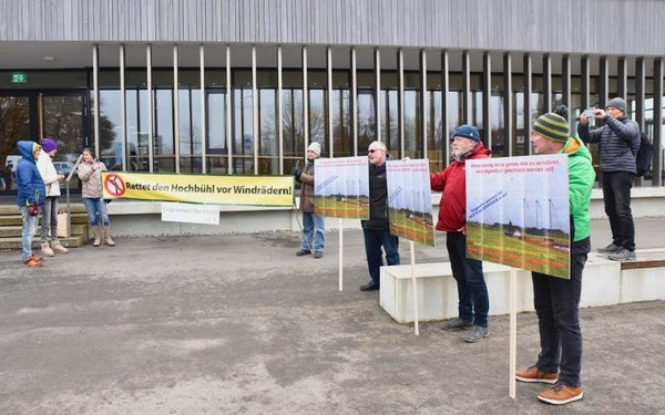 Weitere Bürgerinitiativen für den Natur- und Landschaftsschutz protestieren vor dem Eingang zum Sitzungsraum.