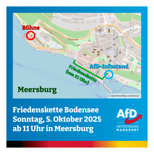 Als einzige im Bundestag vertretene Friedenspartei stehen wir am Sonntag, den 5. Oktober 2025 ab 11 Uhr mit einem AfD-Infostand zum Thema Frieden am Hafen im Osten der Meersburger Altstadt. Wir fordern ganz konkret: Keine Waffenlieferungen in Kriegsgebiete!