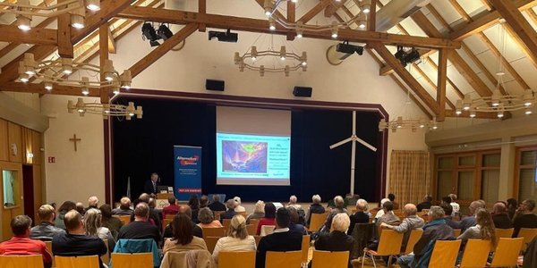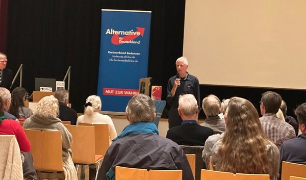 Zu Beginn der gut besuchten Veranstaltung im Bürgerhaus Kluftern führen der Vorsitzende des AfD Kreisverbandes, Detlev Gallandt, und sein Stellvertreter, Andreas Piekniewski, mit einem humorvollen Dialog in die Thematik der Energieversorgung ein.